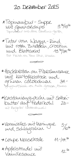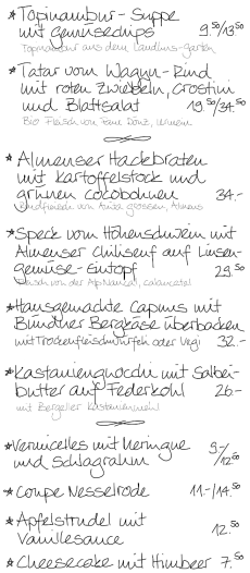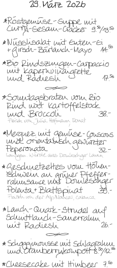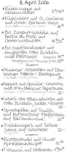 Wir kochen mit Sorgfalt und Liebe – und servieren mit Herz und Verstand. Unser wechselndes Tagesangebot besteht aus vegetarischen Gerichten und solche mit hochwertigem Fleisch, meist Bio. Einige Klassiker sind immer auf der Menükarte. Die Wein- und Käsekeller sind gut gefüllt mit Spezialitäten von nah und fern, die auf Schlemmer und Geniesserinnen warten!